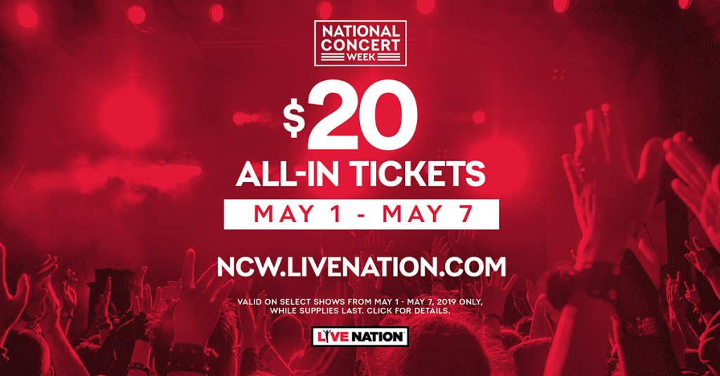 Today Live Nation Canada revealed their fifth annual National Concert Week will take place from May 1stthrough May 7th and give fans the exclusive opportunity to purchase tickets for just $20 (all-in including fees).
