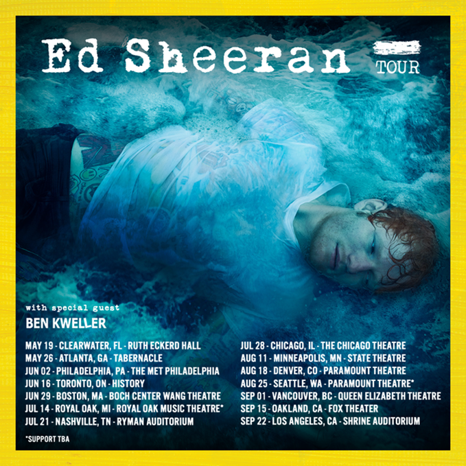| Global superstar Ed Sheeran has announced details for the “- Tour” (pronounced “Subtract Tour”), a very special run of dates set to take place in theaters and auditoriums in 14 cities across North America. Singer-songwriter Ben Kweller supports on most dates. These intimate performances – which kick off at the Ruth Eckerd Hall in Clearwater, FL, on May 19th, and wrap up at the Shrine Auditorium in Los Angeles, CA, on September 22 (see full itinerary below) – coincide with the massive stadium shows of Sheeran’s previously announced “+ – = ÷ x Tour” (pronounced “Mathematics Tour”).