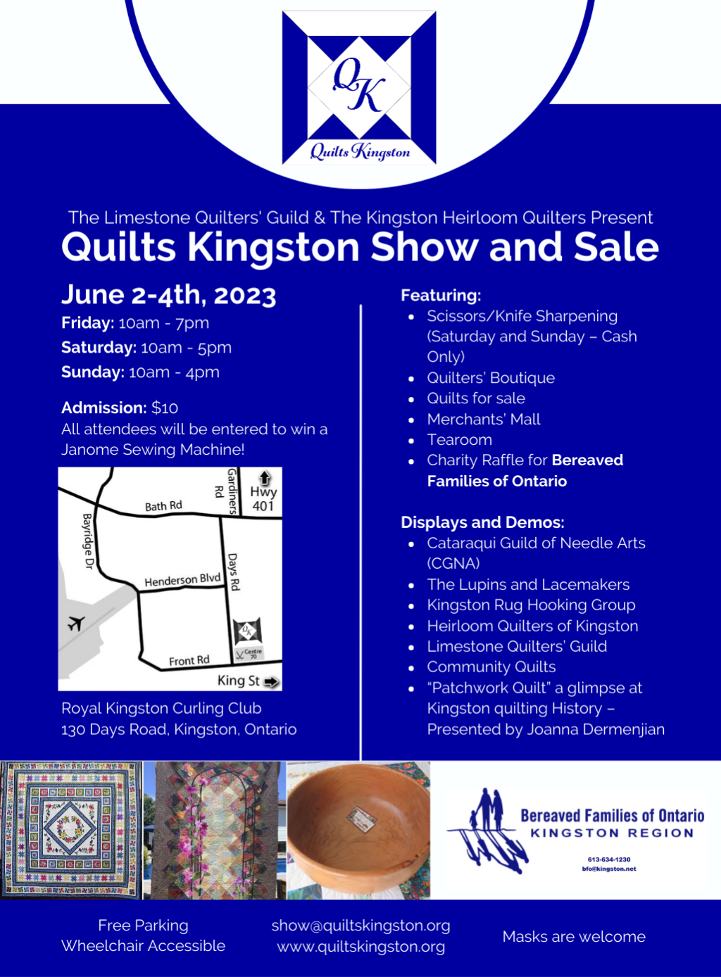 The Limestone City Quilters Guild & The Kingston Heirloom Quilters presents the Quilts Kingston Show and Sale at the Royal Kingston Curling Club! This weekend you can visit the Merchants Mall, Scissors and Knife Sharpening, and see demonstrations from Cataraqui Group of Needle Arts, Heirloom Quilters of Kingston, Community Quilts and more!