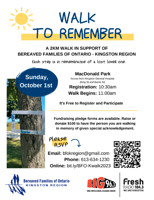 Please join Bereaved Families of Ontario – Kingston Region on October 1, 2023 for the Walk to Remember. Registration will start at 10:30am, with the Walk beginning at 11:00am. This is an annual event that brings us together as a community, remembering both those who are bereaved and those we have lost.