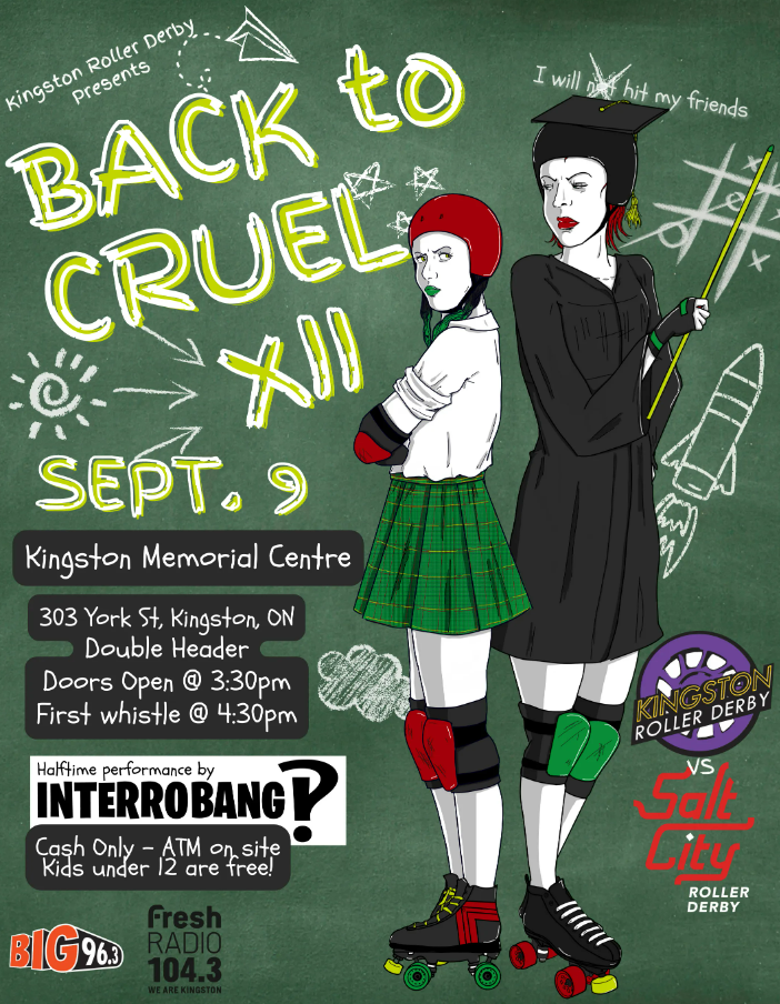 The Kingston Roller Derby finishes up their summer season with Back to Cruel! Kingston Roller Derby offers Trackside Danger Zone seating, vendors, and plenty of derby action. Come early, bring a chair and reserve your seat close to the action!