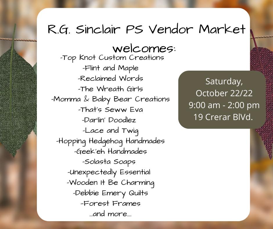 Come and shop 33 local artisans at the RG Sinclair PS Vendor Market on Saturday, Oct 21 from 9:00 am to 2:00 pm!We are also collecting brand new socks for Socktober – Socks Kingston will ensure that collected socks go to those in need in our Kingston community.Each vendor has donated items to create raffle baskets. Tickets will be sold for one ticket for $2 and three tickets for $5. All proceeds raised go directly to learning initiatives at our school.