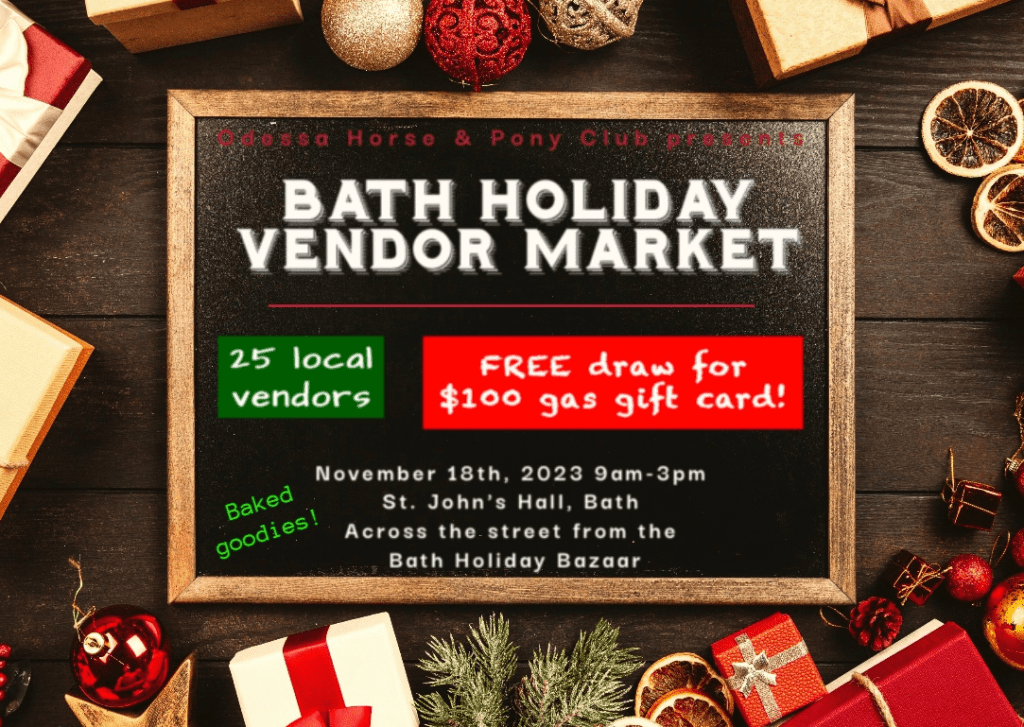 Who wants to WIN a $100 gas gift card?! Everyone who attends our event can enter this FREE draw! Indulge in some delicious HOME BAKED GOODIES.Afterwards head across the street to the Bath Holiday Bazaar, in support of Bath Public School. Adults are $1 & Kids 12 yrs & under are FREE!