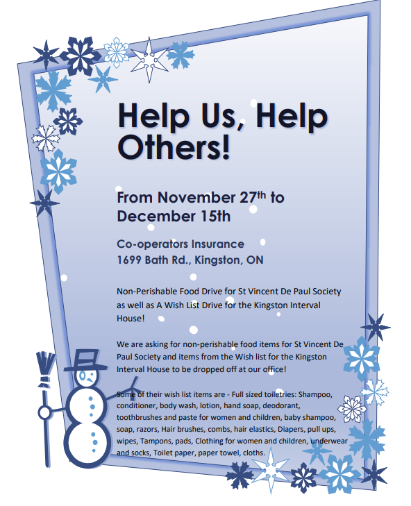 We are asking for non-perishable food items for St Vincent De Paul Society and items from the Wish list for the Kingston Interval House to be dropped off at our office!