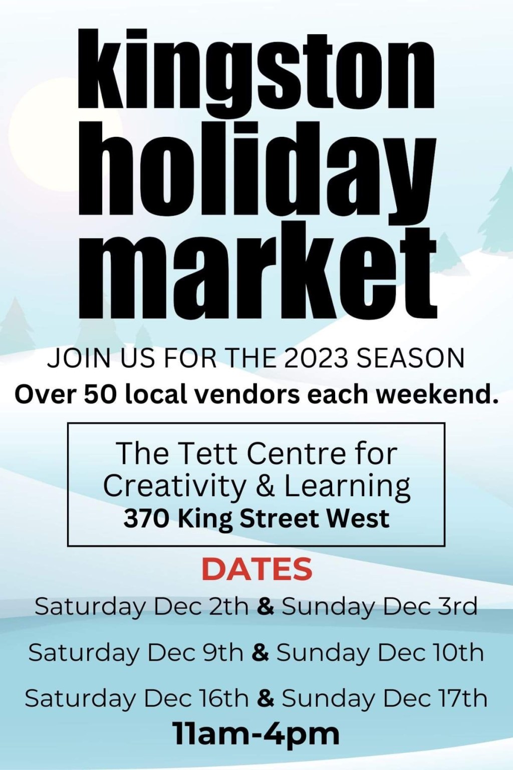 Kingston Holiday Market Where The Tett Centre , 370 King St W, Kingston Map When Dec 02/23 11:00 AM - Dec 17/23 04:00 PM Age All Enjoy 3 weekends of local makers at the Tett Centre. Each weekend enjoy new vendors! Dec 2-3rd Dec 9-10th Dec 16-17th 11-4pm both Saturdays and Sundays FREE ADMISSION 50+ vendors each weekend