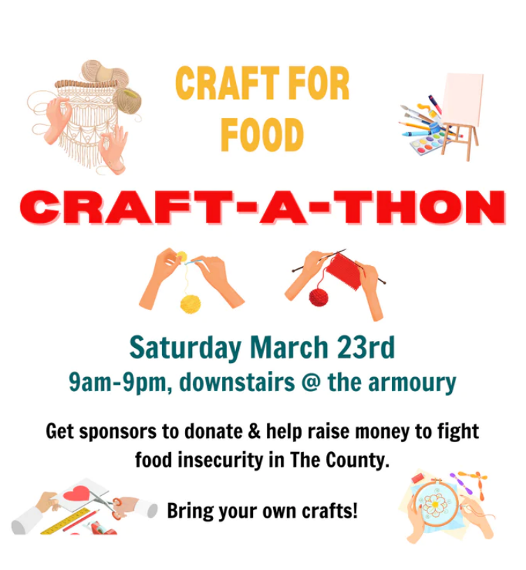 The Craft For Food Craft-A-Thon is working to raise money for our area’s food supporting charities; The Roc, County Food To Share & the Foodbank. Prince Edward County has some of the highest food insecurities in Ontario. This means we have many people and families living here that are unable to feed themselves and their children 3 meals a day!For this event we are asking that you help raise money that will be given to these charities to help feed our community. We are hoping that each person that is taking part will ask friends & family to donate to this event and sponsor you taking on the task of crafting for 12 hours on March 23rd. Can you craft a whole day away? You betcha!You are welcome to bring any craft of your choice.There is no hard and fast rule of staying at the Armoury for the full 12 hours. You can spend part of that time at home crafting and part of the time crafting with us.We will have some fun activities going on throughout the day to keep our energy up and drop in friends are welcome.