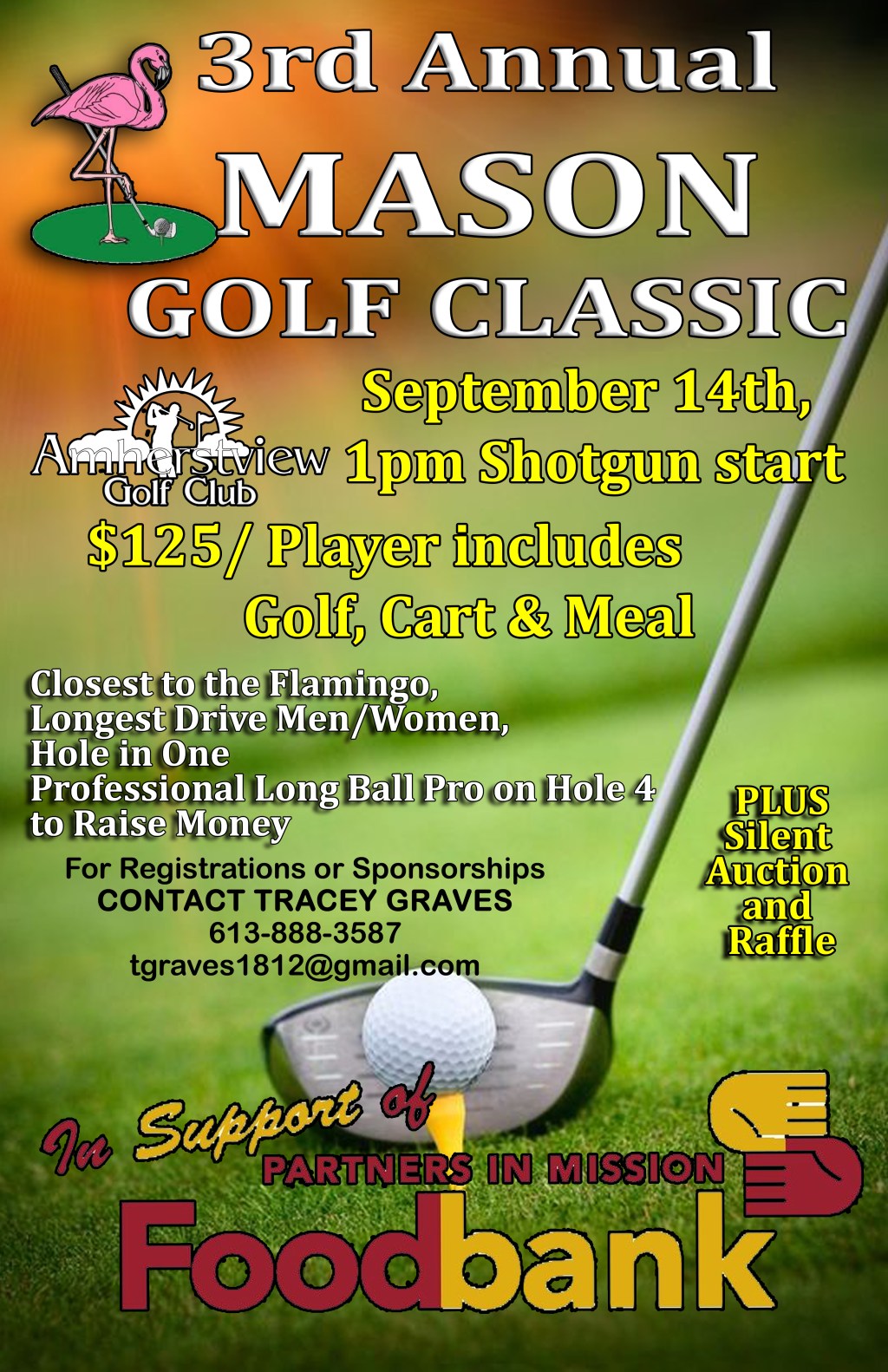 3rd Annual Mason Golf Classic Where Amherstview Golf Club, Amherstview Map When Sep 14/24 01:00 PM - Sep 14/24 08:00 PM Age All In Support of the Partners in Mission Food Bank