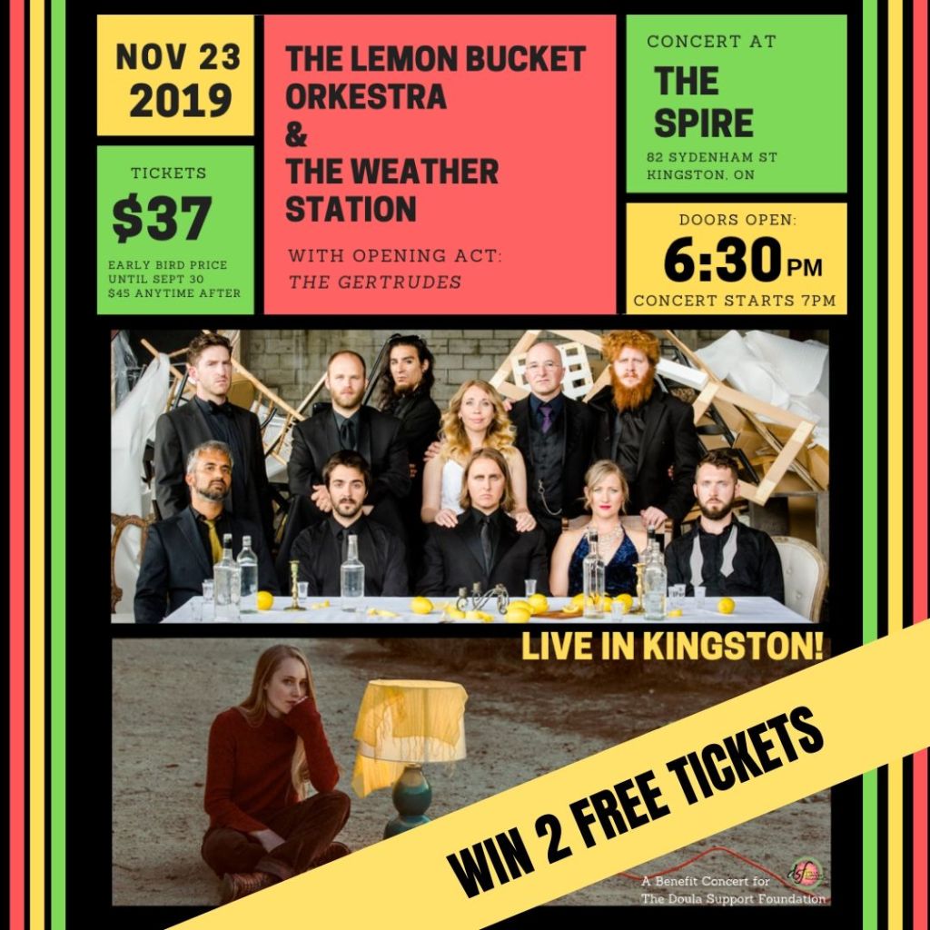 Join us for a fun, musical evening with incredible musicians: The Lemon Bucket Orkestra, The Weather Station, & The Gertrudes. Proceeds from this benefit concert will go to The Doula Support Foundation, a local non-profit working to provide prenatal, birth, and postpartum doula care for low-income families in Kingston, Ontario.