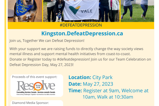 City Park, Kingston The Defeat Depression campaign is a national fundraising campaign designed to allow individuals and organizations to raise funds in support of their local mental health programs and services. It is an initiative of Mood Disorders Society of Canada. Join us by registering for our Walk for Wellness on Saturday, May 27, 2023 at City Park. […]
