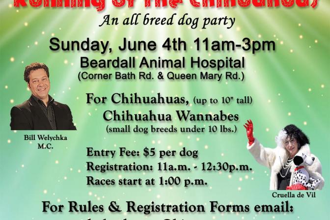 Beardall Animal Hospital, 393 Bath Road, Kingston It’s the seventh annual Running of the Chihuahua’s in support of Sheba’s Haven Rescue! All breed’s are welcomed to join the party on Sunday, June 4, 11:00 AM to 3:00 PM at Beardall Animal Hospital! The running will be emceed by Global’s Bill Welychka, with a special appearance from Cruella de Vil. For more details […]