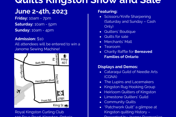 Royal Kingston Curling Club, 130 Days Road , Kingston The Limestone City Quilters Guild & The Kingston Heirloom Quilters presents the Quilts Kingston Show and Sale at the Royal Kingston Curling Club! This weekend you can visit the Merchants Mall, Scissors and Knife Sharpening, and see demonstrations from Cataraqui Group of Needle Arts, Heirloom Quilters of Kingston, Community Quilts and more! Admission is […]