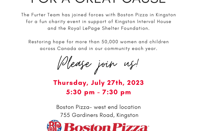 Boston Pizza, 755 Gardiners Road, Kingston The Furter Real Estate Team has joined forces with Boston Pizza in Kingston for a fun charity event in support of Kingston Interval House and the Royal LePage Shelter Foundation. We would love for you to join us for a night of delicious food, fellowship and a silent auction to help restore hope to women […]